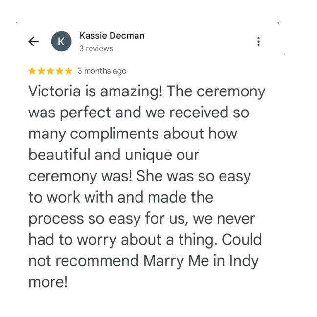 We are professional wedding officiants, Victoria and Peter Meyer.Victoria started Marry Me In Indy! LLC 15 years ago. Peter joined her in 2022.Peter performs civil ceremonies in our office.Victoria answers phones, emails, and will travel to your location to marry you!